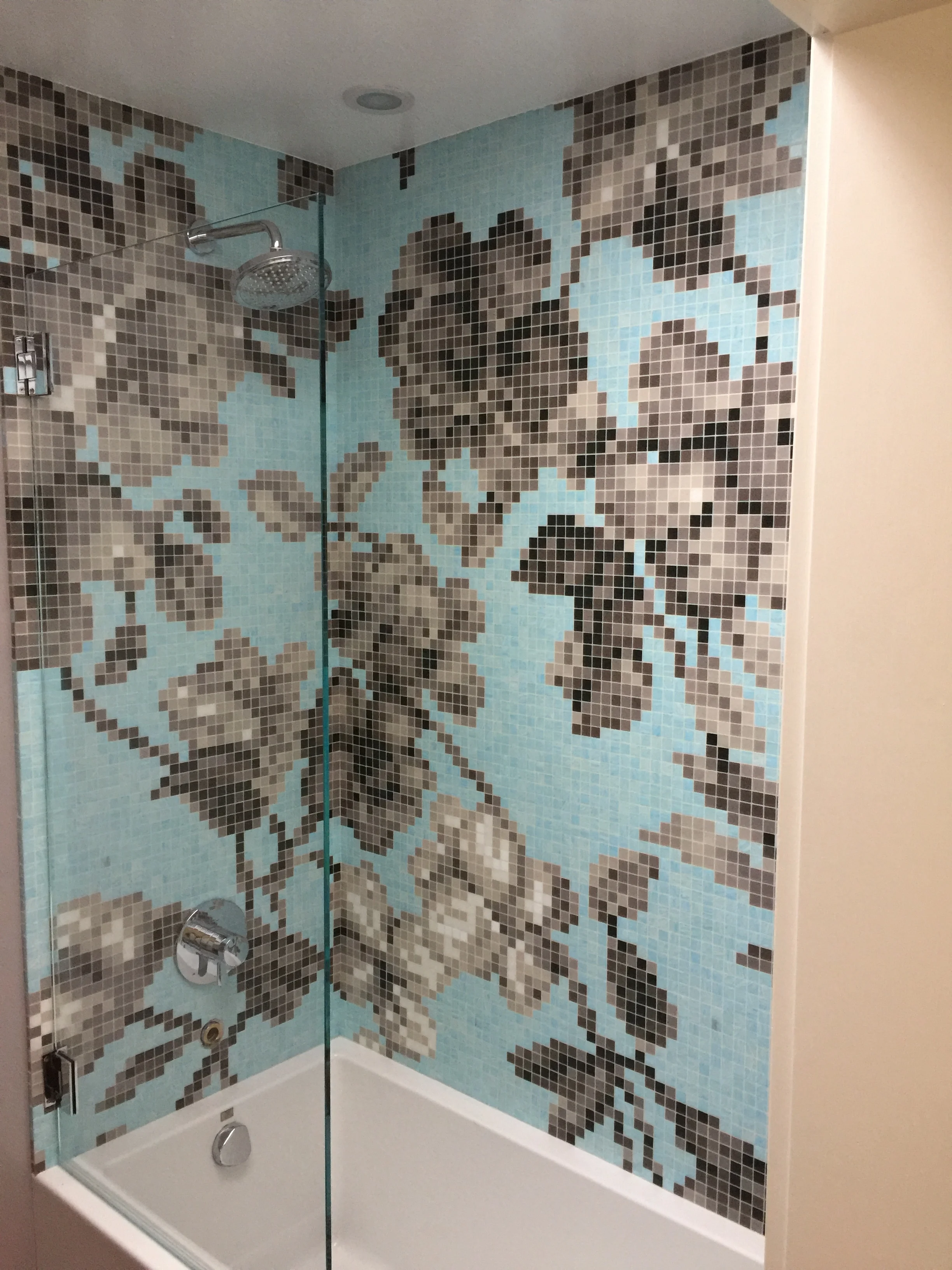 The client was also unhappy with the existing shower tile prior to their bathroom remodel. During a business trip to New York, he found this handmade Italian glass tile and wanted to bring it home. We removed the existing shower walls, installed insulation and wallboard, and laid the new tile. We also installed a new custom-built walnut vanity and improved the lighting and ventilation. This bathroom remodel provided our craftsmen a new medium to show their incredible talents.
